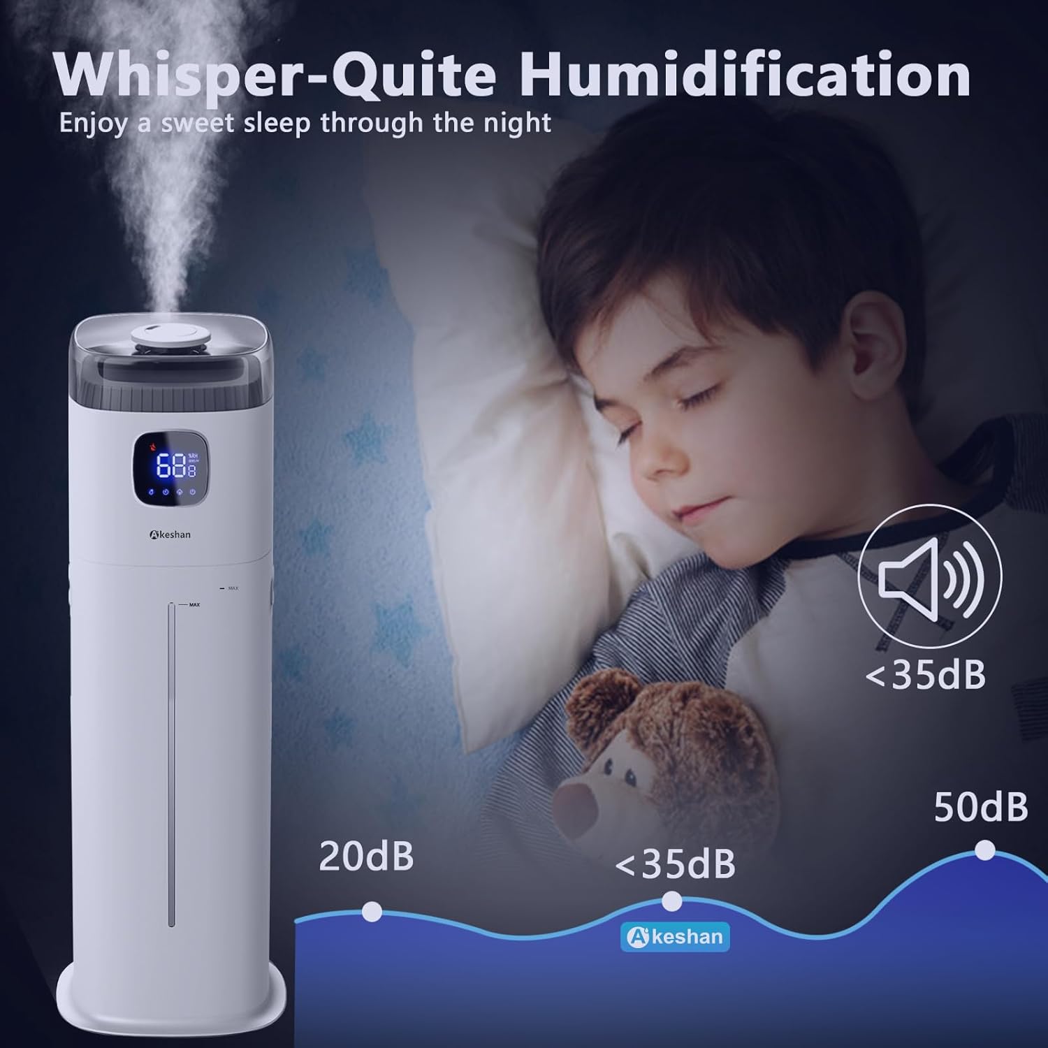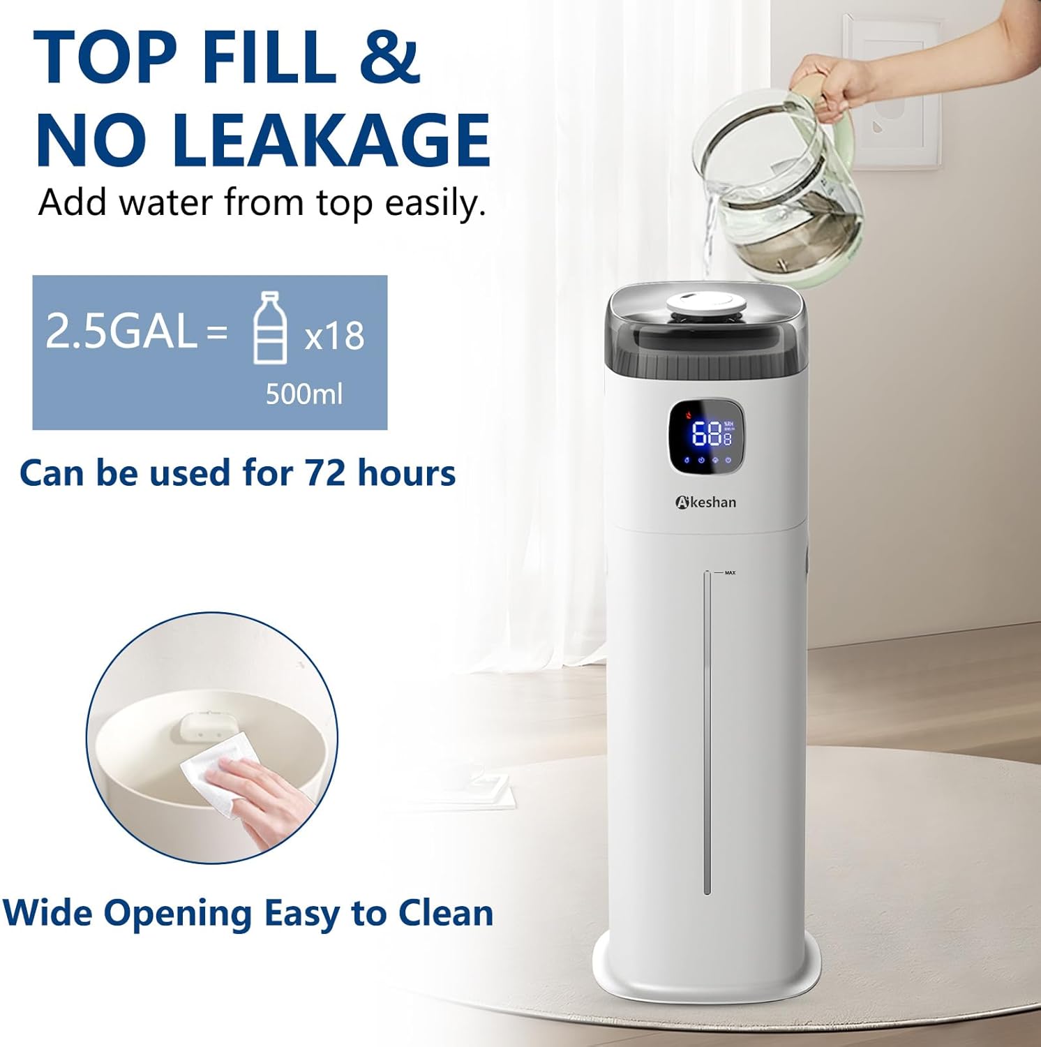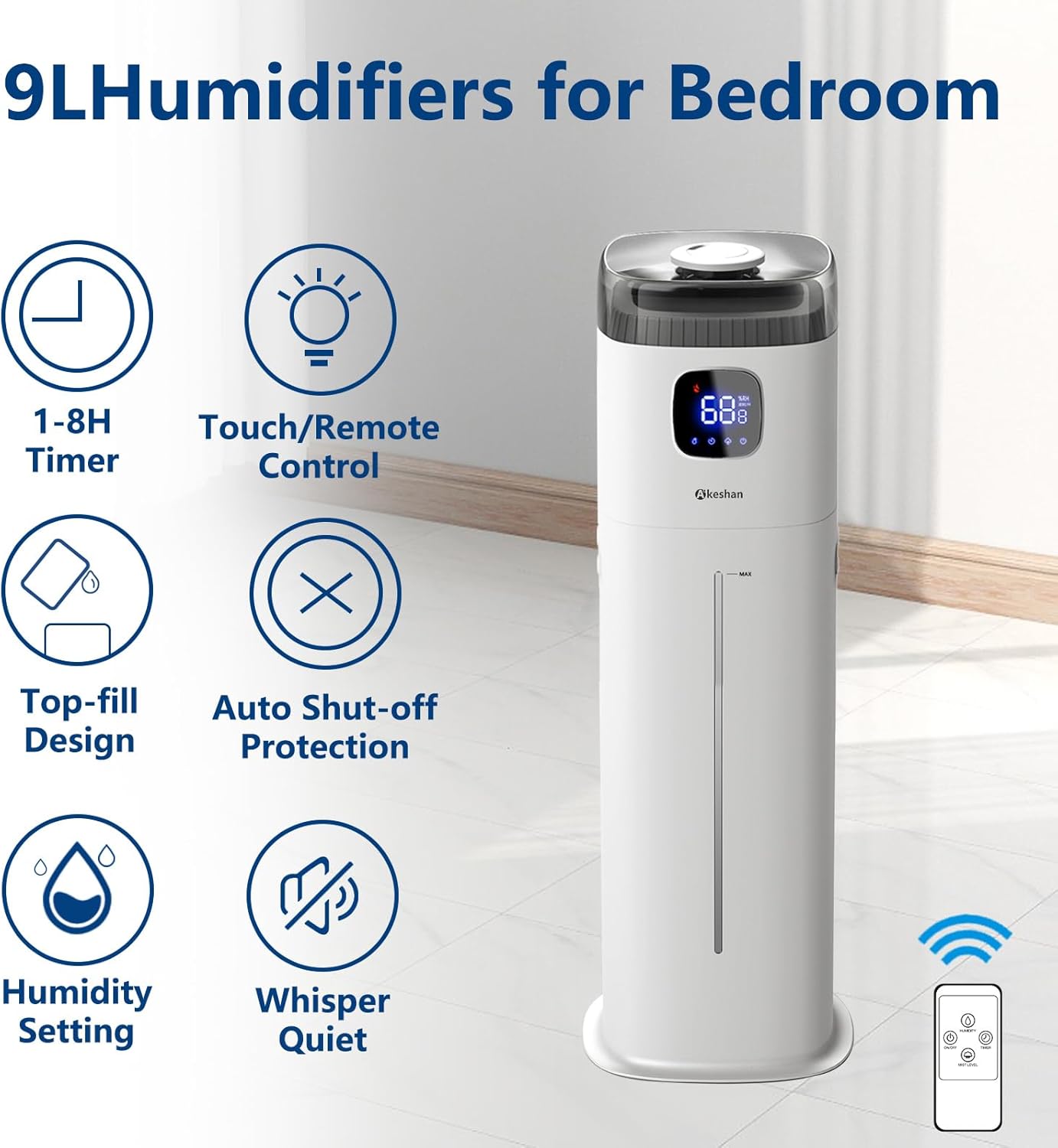 - Akeshan-9-liter large-capacity humidifier, continuous humidification for 60 hours, 350 ml of heavy fog volume per hour, quickly increases air humidity, sub-bass operation, lower than 38 decibels at maximum power, intelligent constant humidity, automatic cut-off when reaching the predetermined humidity .